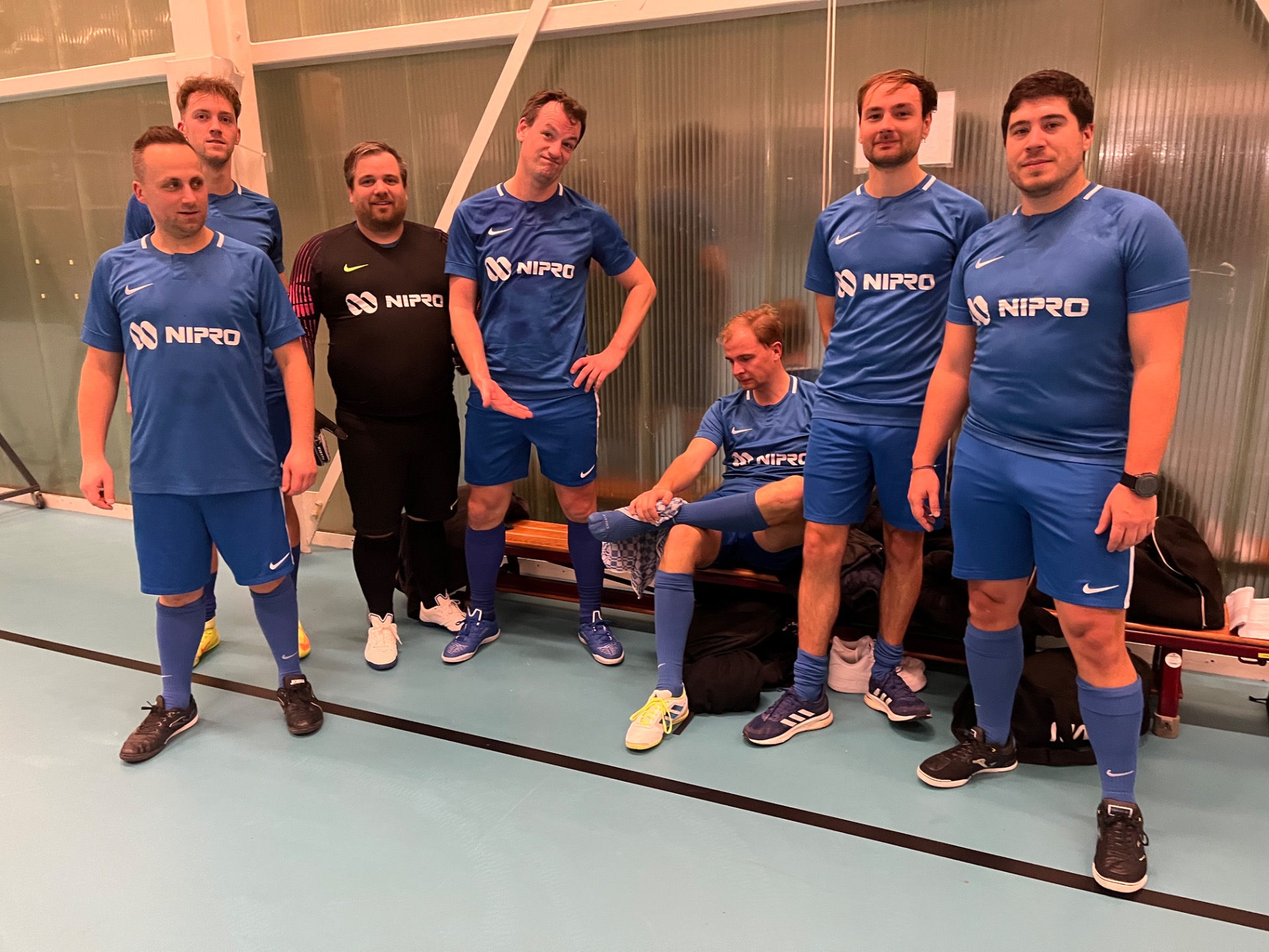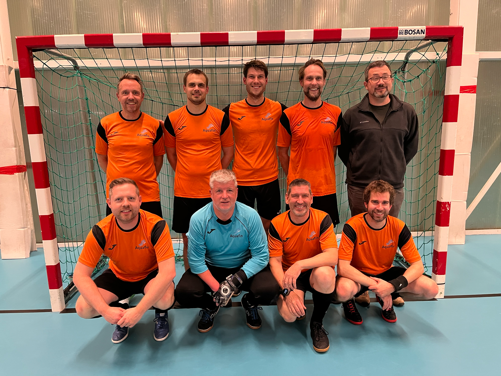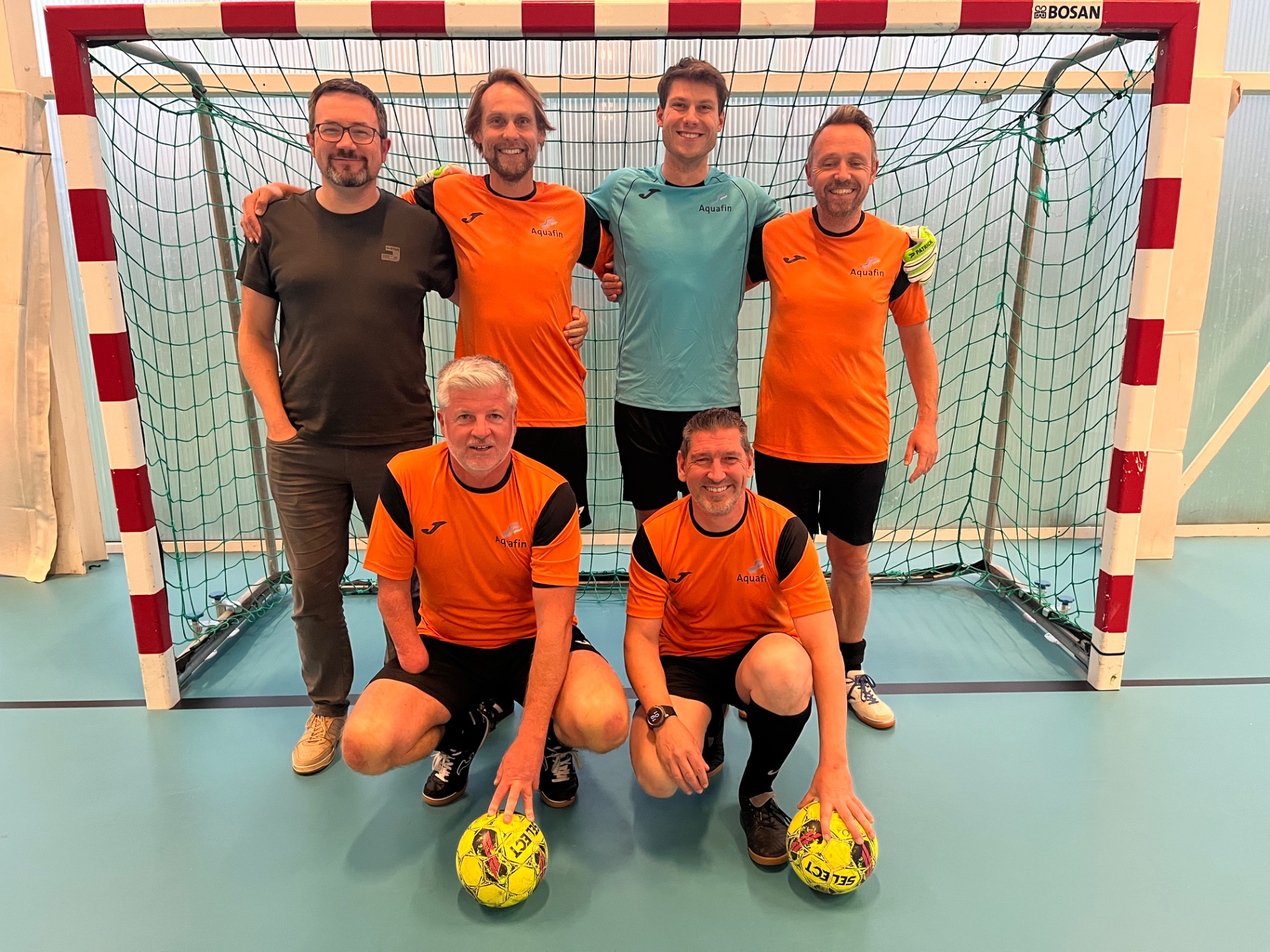 Een beetje later begonnen door allerlei omstandigheden, werd de wedstrijd toch op gang gefloten door scheidsrechter Donny. De mannen van Aquafin traden aan in nieuwe oranje shirts; die van Nipro hadden dan weer prachtige nieuwe blauwe tenues. Aquafin kwam wakker aan de aftrap, want nauwelijks na 4 min. legde Bert Busselen de bal mooi achter de thuisdoelman tegen de netten. Vijf minuten later op pass van Nico Van Gestel kon Stijn Chaves Daguilar de stan verdubbelen: 0-2. Amper 60 seconden later stond de 0-3 op het bord nadat Nico Van Gestel met een afstandsschot de keeper verschalkte die mee naar voren was gelopen. Diezelfde Nico schoot op de 17' nog op de linkerpaal en vervolgens in de 18' op de rechterpaal. Toch konden de blauwhemden nog tegenprikken voor de appelsientjes via Kim Claes die een perfecte pass van Christopher Pelgrims in doel kon verwerken: 1 -3. Het spel werd amper hervat in de 2de helft of het stond al 2-3 via Wouter Verschueren die de bal onderschepte op het middenveld en naar voor stormde met de goal als gevolg!. Twee min. later mooi samenspel tussen Kim Claes via Wouter Verschueren naar Sebastien Gabrielle die met de rug naar het doel, zich omdraaide en in een flits onder de keeper besloot (3-3). Een minuut later verscheen Philip Peeters voor doel en deze kon van kortbij de 4-3 binnenwerken. Aquafin aan de overkant kon nog voor gevaar zorgen door Wim Dhooge, maar z'n poging landde op de paal. Een indirecte vrijschop omdat de thuisdoelman te lang talmde zorgde nog voor druk voor de blauwe muit, maar die van Aquafin hun vizier stond niet perfect afgesteld. Een corner voor Aquafin zorgde zowaar nog voor extra spanning omdat de keeper mee naar voren kwam, de bal onderschept werd en een lange bal naast het Aquafindoel belandde. op de 16' nog zo'n lange bal van Nipro en het was weer zo'n gevoel van billen dichtknijpen voor Aquafin. Naarmate de wedstrijd vorderde kwam Aquafin wat meer aandringen, maar het was toch weer bang uitkijken wanneer de bal bij de tegenpartij belandde, die steevast met de lange bal probeerde de wedstrijd te beslissen. Misschien dat het mannetje meer op de bank de wedstrijd in het voordeel van Nipro deed kantelen... we kijken uit naar de volgden wedstrijd!.