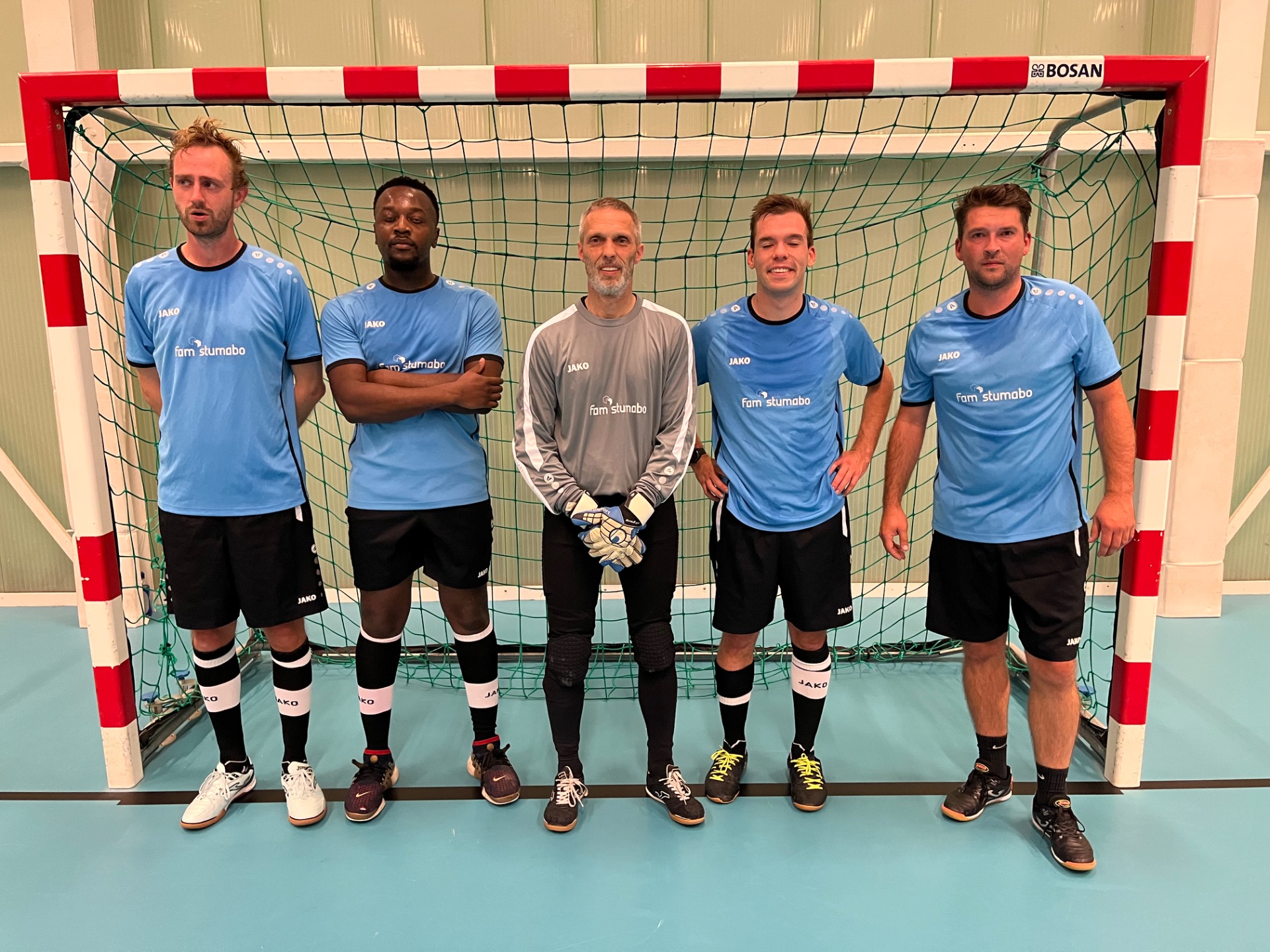 Douchen kunnen we na de wedstrijd in de andere sporthal, alwaar de eerste match slechts begint om 21:00 uur. Equans dat z'n eerste wedstrijd van het seizoen speelde en Fam-Stumabo dat aan z'n tweede begon, dat stond er op het programma van deze avond. Het werd een wedstrijd met twee gezichten: de eerste helft ging zowat gelijk op, maar de tweede helft gaf het overtal aan spelers de doorslag in mijn ogen daar de blauwhemden het niet konden blijven belopen. Op de 2' opende Equans de score via mooi samenspel van Sverre Goetschalckx die mooi passte naar Emiel Van Praet die droog binnen knalde naast de bezoekende doelman (1-0). Lang konden de withemden niet vieren, want nauwelijks twee minuten later hingen de bordjes gelijk wanneer Zeger Bogaert z'n ploegmaat Thomas Bogaerts bedankte met de 1-1. Een paar minuten later kon diezelfde Thomas Bogaerts doorzetten en bracht de stand op 1-2 voor Fam-Stumabo. Emiel Van Praet liet nog een kans onbenut wanneer hij alleen voor de keeper opdaagde, maar de keeper de bal in corner verwerkte. Maar ook aan de andere kant liet men een zo goed als gemaakt doelpunt liggen wanneer Zeger Bogaert alleen voor de keeper opdook, maar niet kon scoren. We gingen rusten met 1-2! De wedstrijd was nog maar pas terug op gang gefloten of het stond reeds 2-2 via Sverre Goetschalckx. Amper één minuut later wist diezelfde een voorsprong uit te bouwen door van dichtbij de 3-2 tegen de netten te jagen. Zijn kompaan Emiel Van Praet kon verhogen tot 4-2 in de 31'. Weer was daar die drommelse Sverre Goetschalckx die de netten vond op tegenaanval: 5-2. Het leek wel of de twee bankzitters extra de wedstrijd deed kantelen want op de 37ste en 38ste minuut verscheen daar ene Tim Brants die enig mooi naast de keeper plaatste en het zo 6-2 werd. Even een opflakkering van Fam-Stumabo met een uitbraak van Arne Heemeryck maar die trapte zijn bal vlak over doel. Dan een bangelijk moment voor de mannen van Equans, wanneer keeper Steven Broeckx de bal slecht het veld inbrengt, recht in de voeten van Thomas Bogaerts, maar deze laatste besluit op de paal en vervolgens wordt de bal in corner verwerkt. Toch zou de stand nog oplopen via Tim Brants die op een snelle tegenaanval aangespeeld werd door Emiel Van Praet en de 7-2 stond op het bord. Pawel Kurleto legde met een plaatsbal de eindcijfers vast voor Equans 8-2.