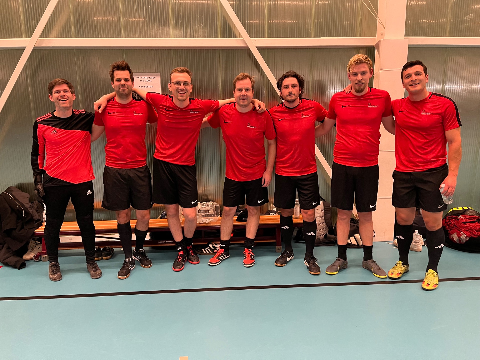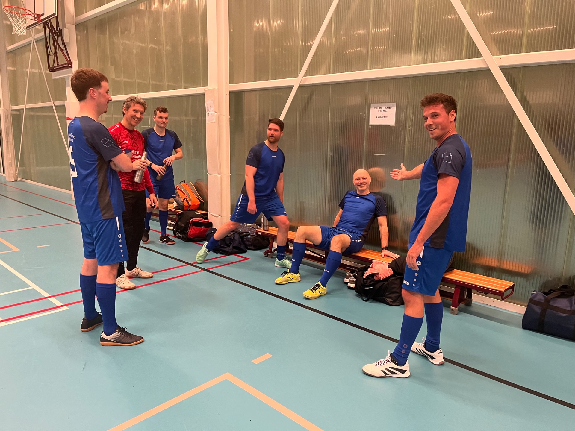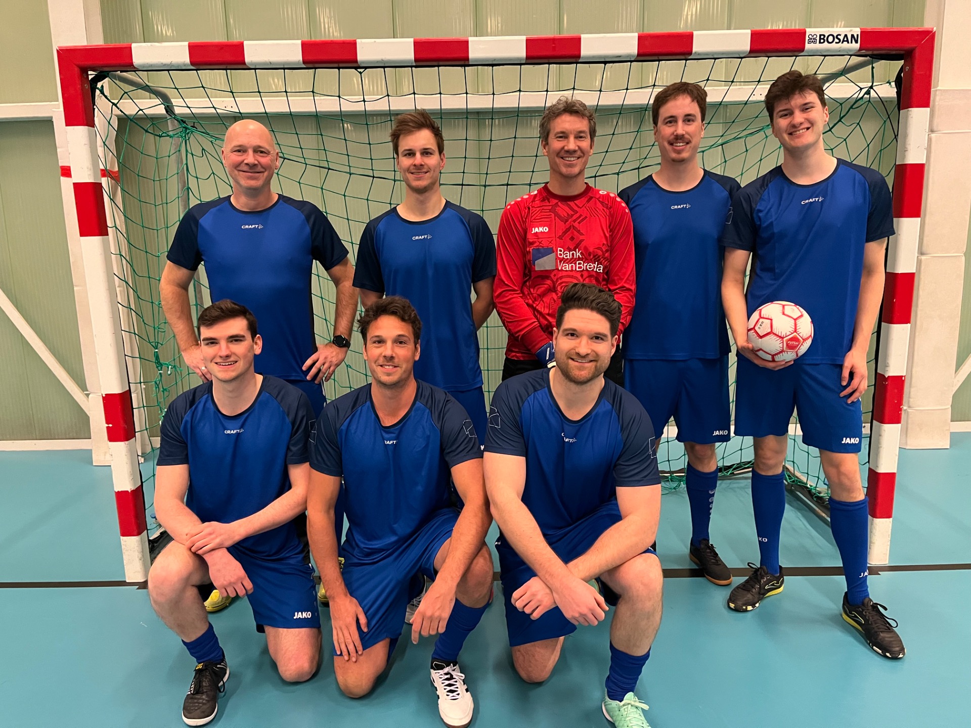 De allereerste wedstrijd van het nieuwe seizoen 2025-2026 werd geopend door regerend kampioen Bank van Breda tegen nieuwkomer Craftzing. Voorwaar geen lachtertje voor Craftzing, zo zou blijken later op de avond. Na het gebruikelijke aftoetsen werd in de 6' de stand geopend door Thomas De Bruin voor de bankjongens: 1-0. Prompt werd een minuutje later tegen gescoord door Thomas Verleye van Craftzing, die goed gevolgd was en makkelijk kon binnenprikken. De bordjes hingen weer gelijk (1-1)! Vlak erop een enig mooie volley op corner door Thomas Van Orshaegen dat wel meer verdiende en aan de overkant schoot Lucas Van Eynde voorlangs. op de 12' nam Thomas De Bruin een corner die via Simon Enthoven bij Lucas Van Eynde terecht kwam die simpelweg kon binnentikken aan de eerste paal (2-1). Ook de 3-1 kwam van zijn voet. De twee volgende doelpunten nam Simon Enthoven op zijn konto en zo stond het op de 20' 5-1. We gingen rusten met 5-1 in het voordeel van de bankiers. Na rust werd het 5-1 door Tom Franck na een mispoes bij de spelhervatting door Craftzing. Op de 33' milderde Thomas Van Orshaegen enig mooi tot 6-2, maar vijf min. later liep BvB weer verder uit via Alex Coucke (7-2). Vervolgens scoorde Lucas Van Eynde de 8-2 en 9-2 tegen de netten; kon Craftzing nog eens tegenscoren via Thomas Verleye en legde Alex Coucke de eindstand vast: 10-3. Voetbaltechnisch waren de bankiers wel wat beter dan hun opponent, maar zonder doelman Ben Stevens had de score nog hoger kunnen oplopen....