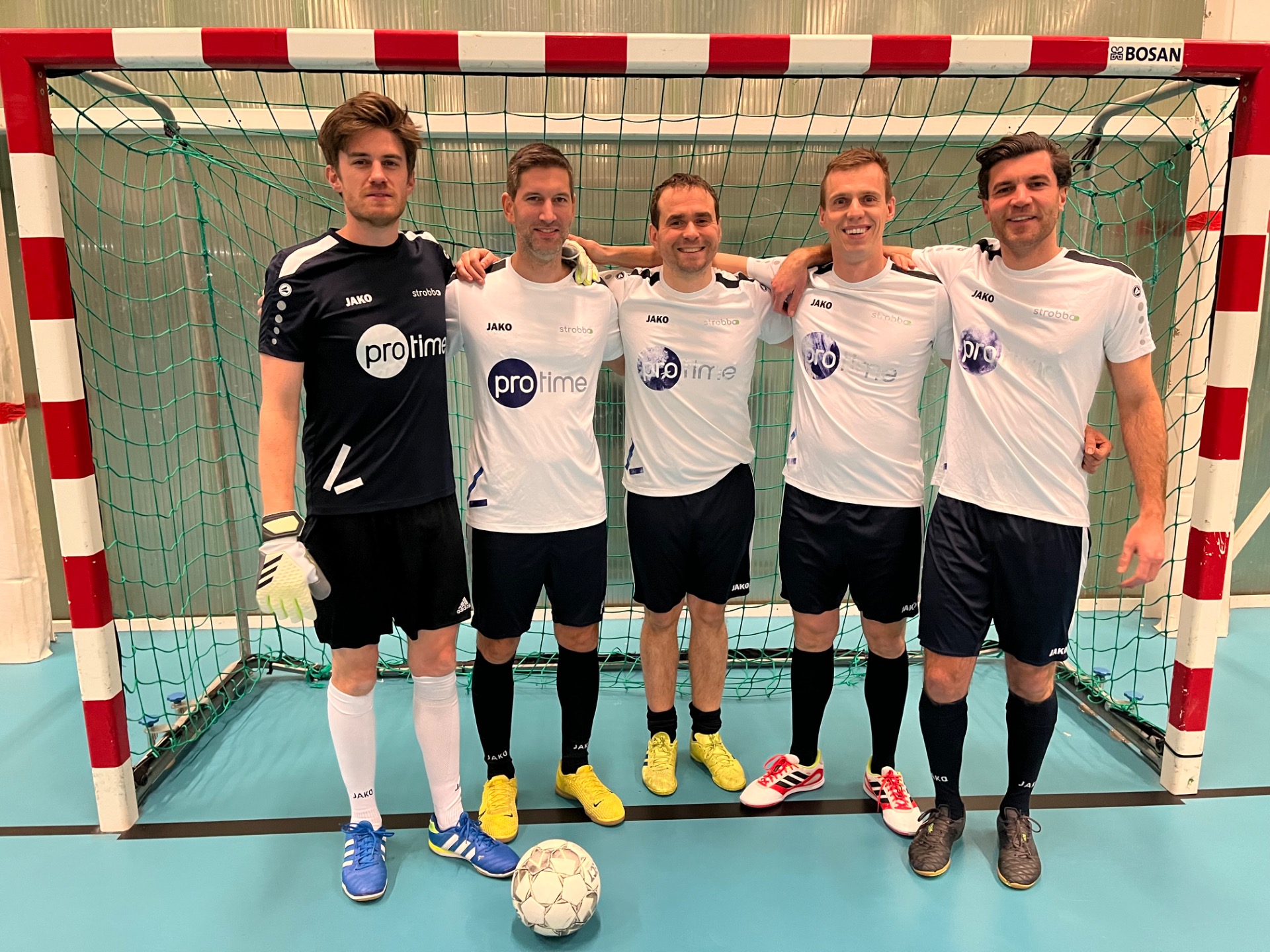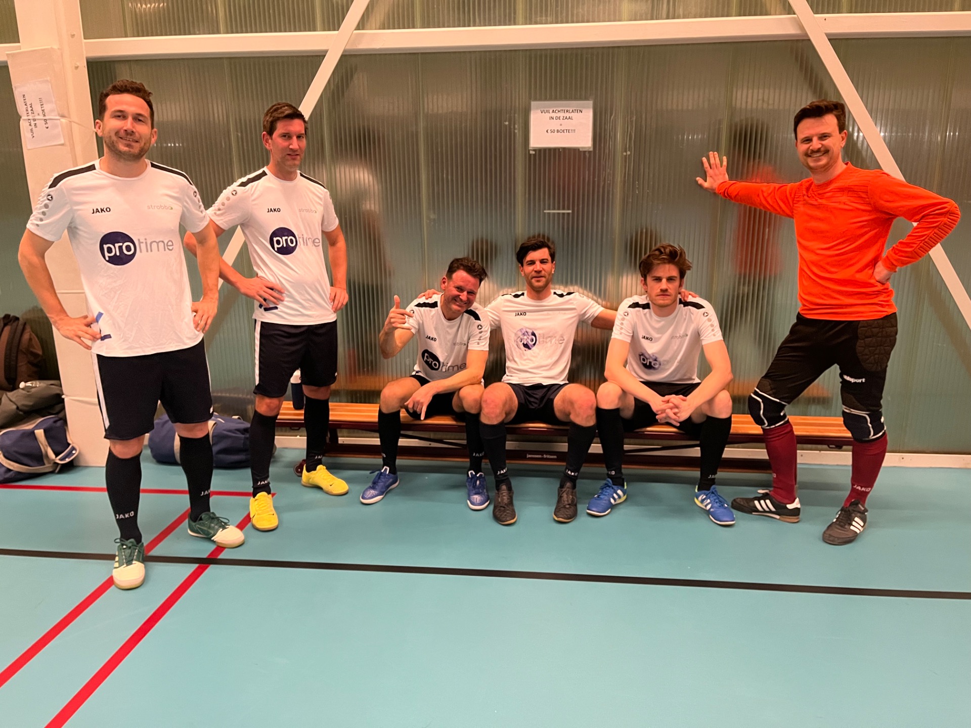 PROTIME - BANK VAN BREDA was een pracht van een wedstrijd met constant over-en-weer zaalvoetbal op een hoog niveau. Een pareltje voor de toeschouwers. Eén minpuntje aan deze wedstrijd: Protime kon slechts beroep doen op 5 voetballers en dat zou zich naarmate de wedstrijd wreken tegen de 8 spelers van BvB. Al bij al dus een zeer aangename wedstrijd waar de kansen niet al te lang op zich lieten wachten. Reeds op de tweede minuut van de wedstrijd was het reeds zo ver en werden de netten voor de eerste keer bol gezet: hoog spel voor doel van Protime en Lucas Van Eynde mocht twee maal achter elkaar aanleggen: 0-1! Direct erop volgend een tegenprik van Protime via Sander Swyzen via Yannick Van den Bosch naar Toon Van Hout, maar deze besloot nipt naast. Aan de overkant een schicht van Lucas Van Eynde die rakelings naast het doel ging, een poging van Yannick Van Den Bosch die van dichtbij toch nog naast besloot. Op de 11' schoot diezelfde Yannick Van den Bosch dan toch mooi schuin langs de bezoekende keeper binnen: 1-1. Kort erop weer een aanval van Protime via Toon Van hout, over Yannick Van den Bosch tot bij Steinlechner Joseph maar die schoot vlak over de dwarslat. BvB reageerde via Alex Winderix en vervolgens via Thomas De Bruin van aan het penaltypunt, maar beide pogingen brachten jammer genoeg voor hen niks op. Tot in de 19' Lucas Van Eynde met een schuiver de 1-2 op het bord zette met een prachtige schuiver voorbij de verbouwereerde thuisdoelman: 1-2. Lang treurden die van Protime niet want amper 1 minuutje later hingen de bordjes alweer gelijk na een raid vanop links van Yannick Van den Bosch en gingen we de rust in met 2-2! Na de rust identiek beeld, alleen veranderde Protime van keeper en ging Philip Covent mee in het veld spelen. Op de 6' van de tweede helft kon Thomas De Bruin op pass van Lucas Van Eynde simpelweg binnenleggen aan de tweede paal: 2-3. Amper één minuut later kon Lucas Van Eynde zelf de bal binnentrappen vanop rechts: 2-4. Protime reageerde met een lob van Yannick Van den Bosch, maar die ging naast de goal. Via een corner konden de mannen van Protime dan nog voor gevaar zorgen, maar uiteindelijk besloot men naast. Op de 11' kon Zidan Bortels mooi binnenknallen na een gekregen bal van Thomas via intrap aan de zijlijn: 2-5. Een voorsprong waaraan Protime niet veel meer zou kunnen veranderen doordat ze moeite begonnen te krijgen met alles te belopen niettegenstaande de betere individuele kwaliteiten, maar BvB speelde het spelletje qua overtal nu eenmaal volgens het boekje uit. Toch konden de withemden in de slotminuten nog minderen via man van de match Yannick Van Den Bosch: 3-5!