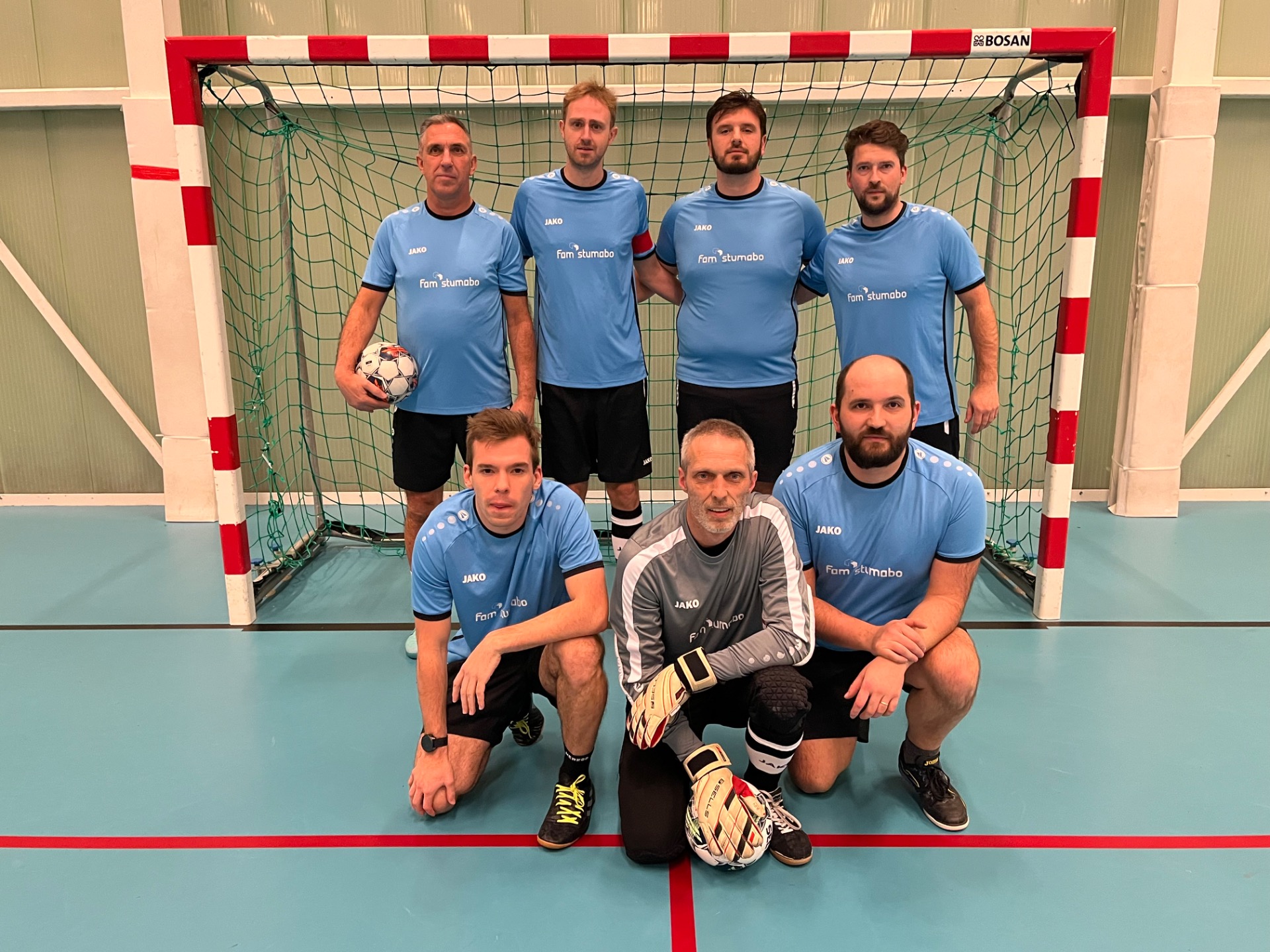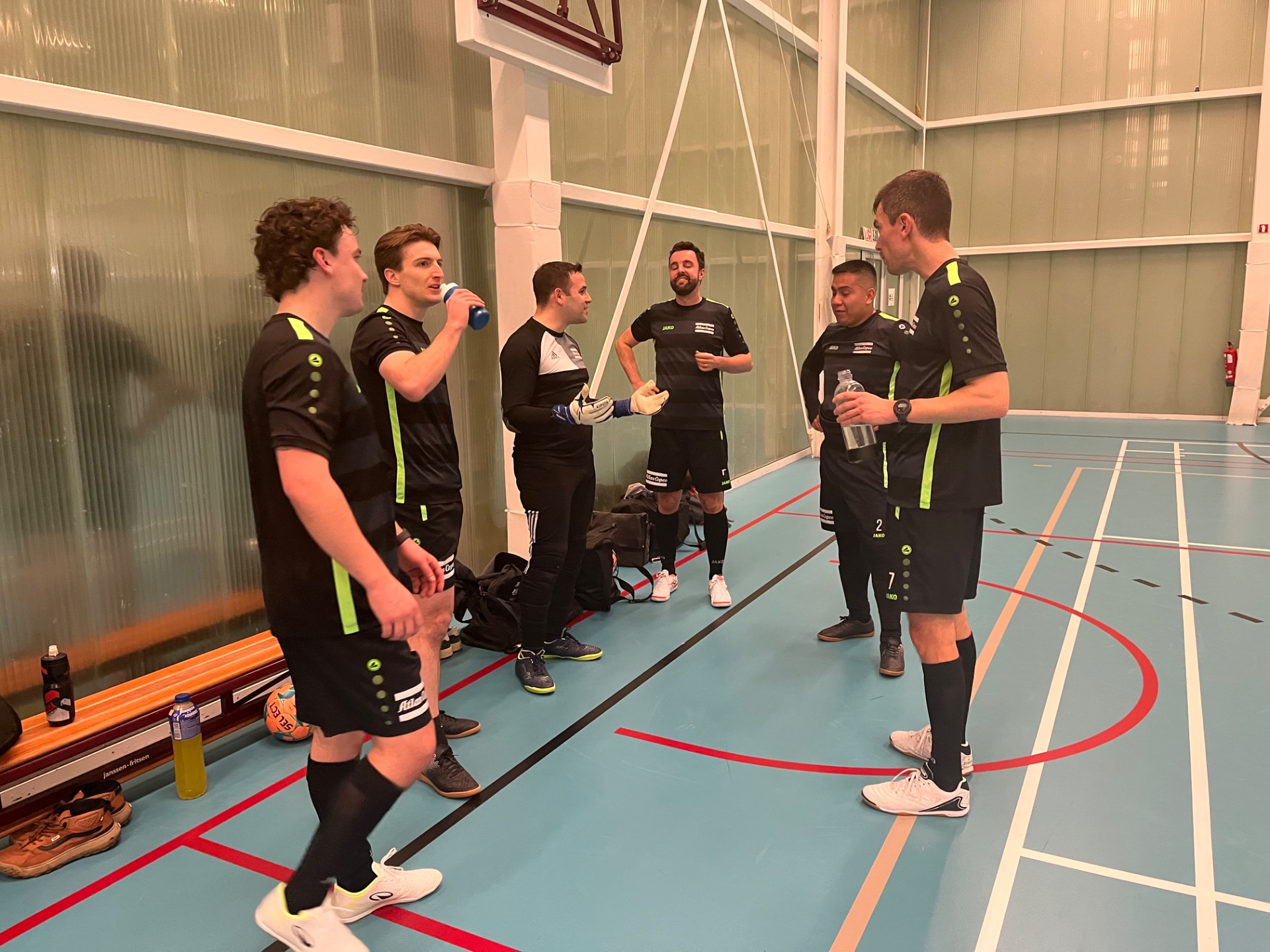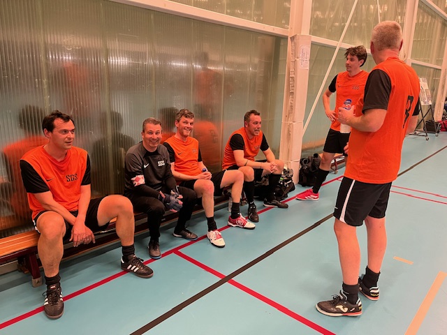 FAM-STUMABO - SGS was ook een mooie wedstrijd en leuk om te volgen voor de supporters, maar van een niveautje minder dan de vorige partij. Hier was sprake van een ouderwets zoeken waarbij beide partijen ruim de tijd namen hoe ze best de andere pijn zouden kunnen doen. SGS nam hierbij het meeste initiatief en het was via Niels Van Der Auwera die de eerste echte poging ondernam, maar zijn schot ging naast. Nauwelijks 2' later was het wel raak wanneer Wim Beckers onder de keeper vanop links de 0-1 op het bord liet plaatsen. We telden dan reeds 14 op de klok. Een aanval opgezet door Thomas Bogaerts naar Esad Goran kon niet besloten worden door deze laatste, maar op de 19' kon Zeger Bogaert zich wel doorzetten op pass van Arne Heemeryck en stonden de bordjes weer gelijk: 1-1. Fam-Stumabo ging door op z'n elan en amper één minuut later verscheen daar Zeger Bogaert weer nu op pass van Esad Goran, maar deze keer kon hij niet scoren. Aan de overkant liet SGS zich zien via Willem Van den Eynde maar zijn poging ging voorlangs. Toch kwam SGS weer op voorsprong in de 21' via Willem Van den Eynde: 1-2! Twee min. later zorgden ze weer voor gevaar via Abdelkarim El Abdellati met een dubbelpas naar Willem van den Eynde, maar uiteindelijk belandde de bal in corner. Even later Kevin Segers die Niels Van der Auwera aanspeelde maar die schoot dan weer voorlangs. FAM-Stumabo repliceert via Thomas Bogaerts maar zijn laatste pass wordt nog gestopt door een verdediger. Dan beginnen we aan een dolle vijf minuten! Kevin Segers bedient Niels Van der Auwera en het staat 1-3 (28'). FAM reageert via Thomas Bogaerts in de 29' met een prachtschot: 2-3. Zeger Bogaert kan voorwaar de gelijkmaker binnenschieten op pass van Thomas via Arne Hemeryck: 3-3 (30'). SGS dacht niet met ons en via Elias Vermeiren liepen ze in de 31' min terug uit: 3-4. Ah zo dachten ze bij FAM-Stumabo en via Thomas Bogaerts kwam de bal bij Zeger Bogaert terecht die er geen gras liet over groeien: 4-4. Een supersonische knal van Elias Vermeiren verdiende misschien meer ipv vlak naast doel te pletter te vliegen tegen de muren van de hal (chance dat die nog kon blijven rechtstaan) en even later kon een voet van een tegenstrever een doelpunt verhinderen, maar toch zouden zij -SGS- de rust ingaan met een kleine voorsprong wanneer Elias Vermeiren iedereen oprolt en naast de doelman kan besluiten: 4-5. Tweede helft was een copij van de eerste helft en SGS begon weer een paar keren aan het deurgat kijken: eerst via Willem Van den Eynde op pass van Elias Vermeiren, dan Niels Van der Auwera die nipt naast besloot. Toch zou het Thomas Bogaerts zijn die na een raid iedereen in de wind wist te zetten en mooi binnenlegt: 5-5. Kevin Segers besluit rakelings naast voor SGS, maar in de 10' vd tweede helft lukt het toch eentweetje tussen Elias Vermeiren en Abdelkarim El Abedellati brengt de bordjes op 5-6. Nauwelijks één min later staat het weer 6-6 via Zeger Bogaert. Gaan we weer dolle minuten tegemoet? Die vraag ligt op ieders lippen en zal een negatief antwoord krijgen, want hoezeer de poging van FAM-STumabo ook verdiend zou geweest zijn, de bal wilde er niet meer in voor hen. Erger nog, SGS wist het zeil naar zich toe te trekken met nog een doelpunt van Niels Van der Auwera op de 23' 6-7 en amper een minuut later via Wim Beckers: 6-8. Een laatste poging van Arne Heemeryck kwam te laat en te hoog... Al bij al een mooie wedstrijd waarin een gelijkspel het juiste beeld zou zijn.