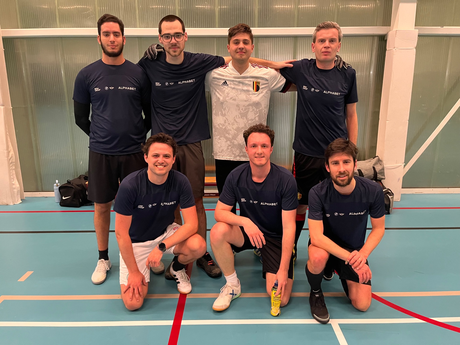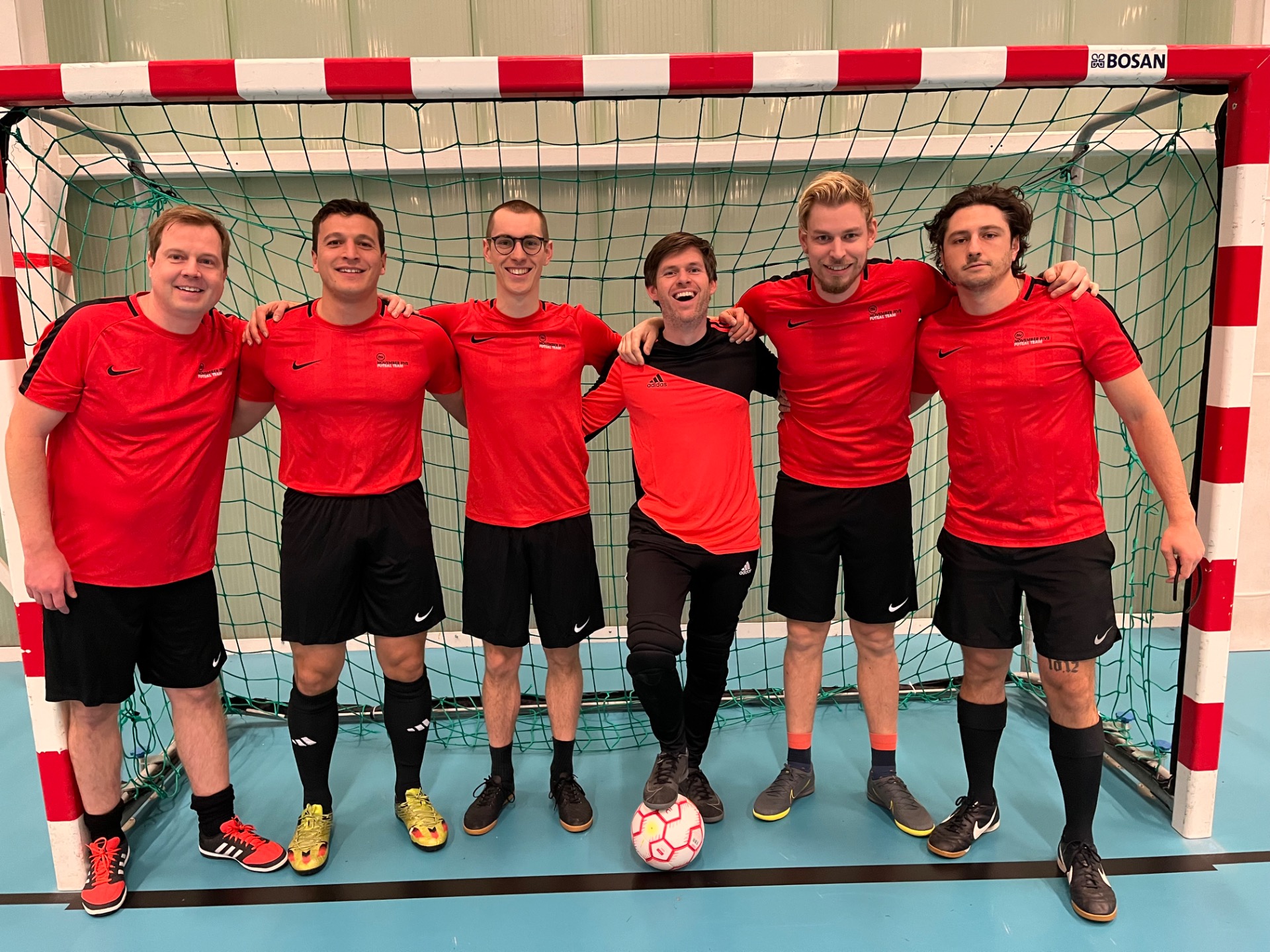 BMW - NOVEMBER FIVE was dan weer zo'n wedstrijd waarvoor je altijd naar de sporthal zou willen komen: op en neer met veel futsaldoorzicht, goede looplijnen en spelers die elkaar bijna blindelings vinden. Een lange inloopperiode werd adrupt onderbroken wanneer Kurt Dierens een bal recupereert op eigen helft en naar de goal knalt ter hoogte van de backlijn met positief resultaat: 1-0! Een bal van Gabriele Strisciuglio gaat tergend traag naar de linkerhoek, maar de plaatselijke keeper kan alsnog de bal in corner slaan. Een schicht van Sander Loncke gaat nipt over, maar nog indezelde minuut kan hij een bal recupereren en schiet in de linker winkelhaak de 1-1 tegen de netten in de 10'. Ibrahim Ahadouch knalt nog eens op doel, maar zijn bal gaat nipt naast de verkeerde kant van de paal. Simon De Temmerman bedient even later Ibrahim Ahadouch aan de tweede paal, maar Thomas Van Sundert kan de bal nog met een wonderbaarlijke reflex onschadelijk maken. en zo gaan we na een spannende eerste helft de rust in met een gelijke stand (1-1). De tweede helft is amper op gang gefloten of daar zijn de BMWjongens weer met de 2-1 na een aanval van Michael Saey die Ibrahim Ahadouch bedient, de keeper die tussenkomt maar de bal niet kan klemmen en zo komt de bal terecht bij Mathhias Swinnen die simpelweg binnenschiet: 2-1 in de derde minuut! Lang bleef die stand niet staan, want amper twee minuten later hingen de bordjes alweer gelijk met een magistraal schot van Hakan Bayryamov die zag dat de keeper uit zijn doel stond en met een schuiver tekende voor de 2-2. Een verre uitworp van Thomas Van Sundert naar Joren Van Hemelrijk had meer in zijn mars kunnen hebben, had Joren de bal goed geraakt... Simon De Temmerman knalde op de dwarslat aan de overkant en toch zou het nog November Five zijn die een voorsprong uitbouwde door Joren Van Helmelrijk die de ganse lijn afliep op pass van Hakan Bayryamov (2-3) in de 10'. Geert Wille trapt nog eens op de keeper, Ibrahim Ahadouch schiet voorlangs en Hakan Bayryamov zet zich nog eens door op rechts maar mikt naast. Een schot van Ibrahim Ahadouch knalt uit elkaar op de winkelhaak en even later kan Matthias Swinnen de verdiende 3-3 achter Thomas Van Sundert deponeren (20'). Iedereen dacht dat dit wel eens de eindstand zou worden, maar ene Gabriele Strisciuglio dacht daar anders over: op pass van Joren Van Hemelrijk knalde hij de 3-4 tegen de netten. Amper een minuut later was het weer prijs, dit keer door Seppe Rousseau die de bal tussen de benen van de plaatselijke keeper schoot: 3-5. Een laatste raid van de plaatselijke doelman Tom Pycke kon daar niks meer aan veranderen. Jammer dat er een verliezer moet zijn in zo'n mooie wedstrijd.